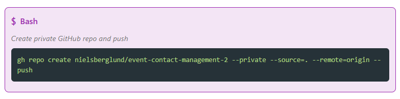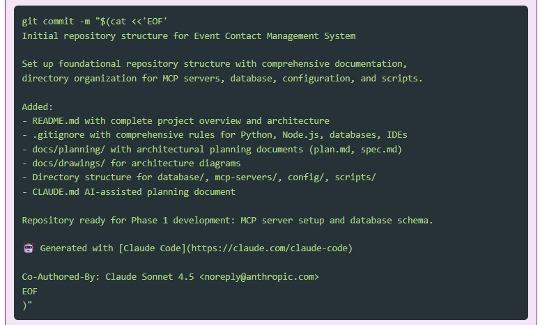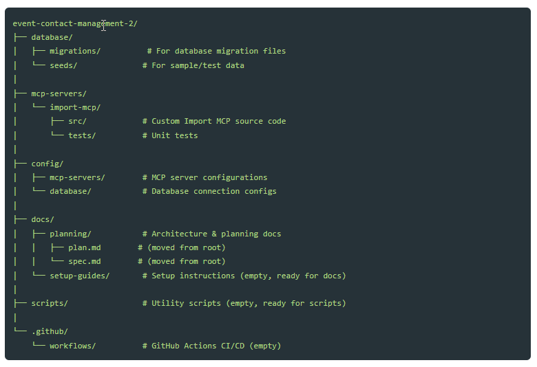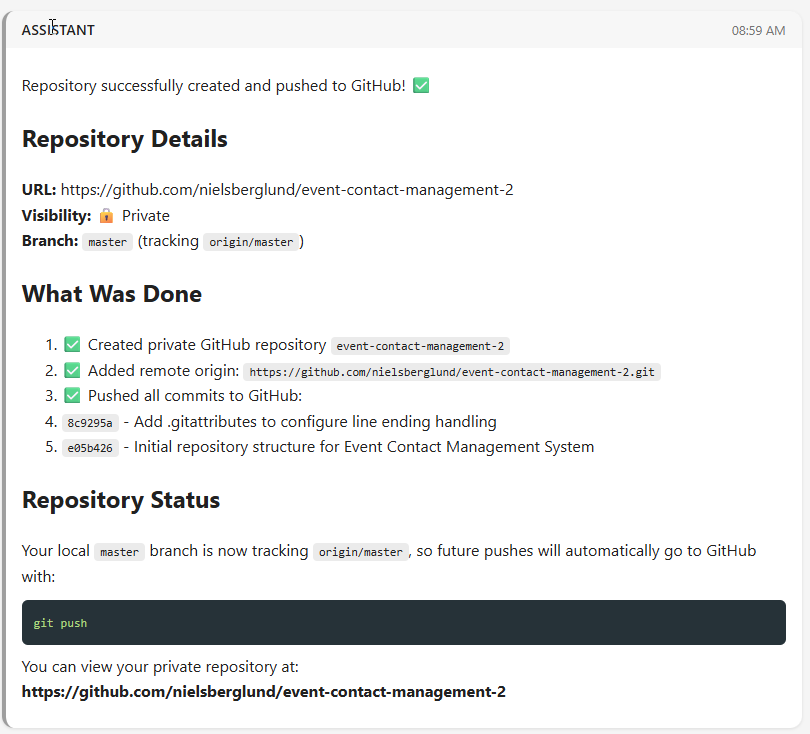 In the previous posts, we worked in “temporary” directories (claude-test, event-contact-management-2), but now we’re building something real. I needed proper version control, a GitHub repository, and a project structure that makes sense.