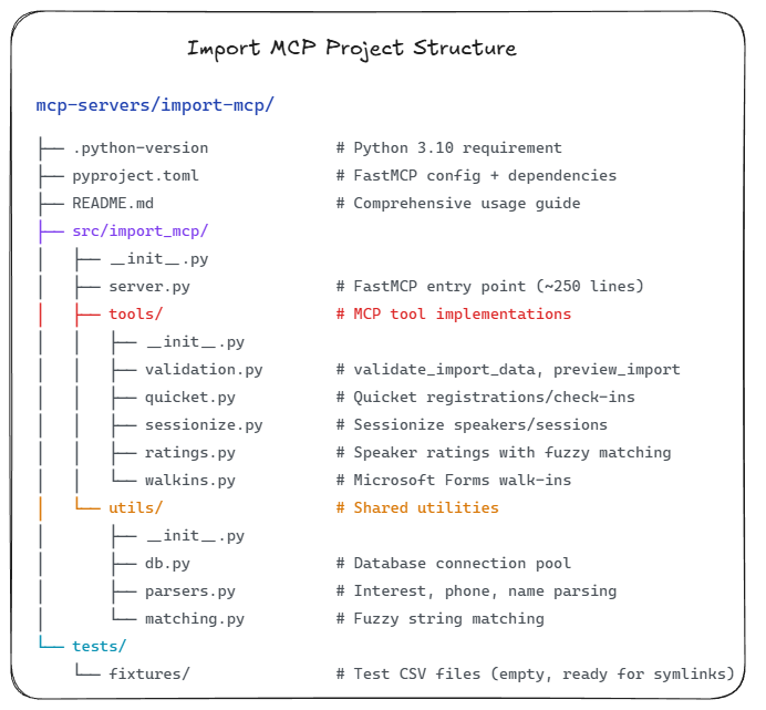 Today is where the magic happens. We’re going to build the actual Import MCP Server that transforms my 2-3 hours of post-event manual data wrangling into a 2-minute conversation with Claude Desktop.