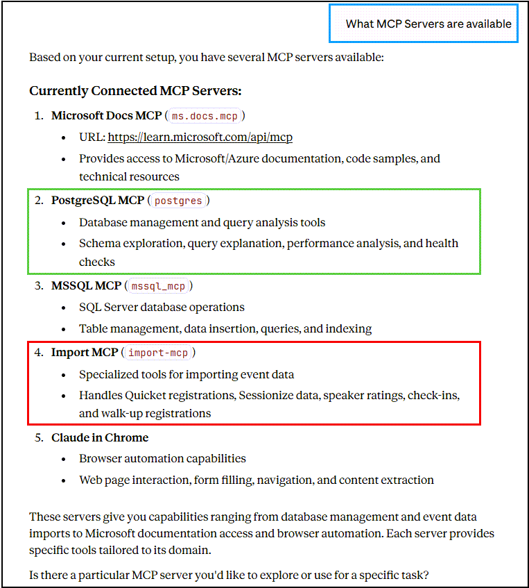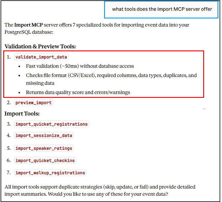 What you see in Code Snippet 2 is the entire import process condensed into a single tool call. No inter-server communication, no complex orchestration, just one tool that does it all.