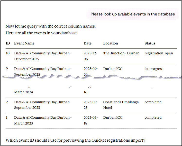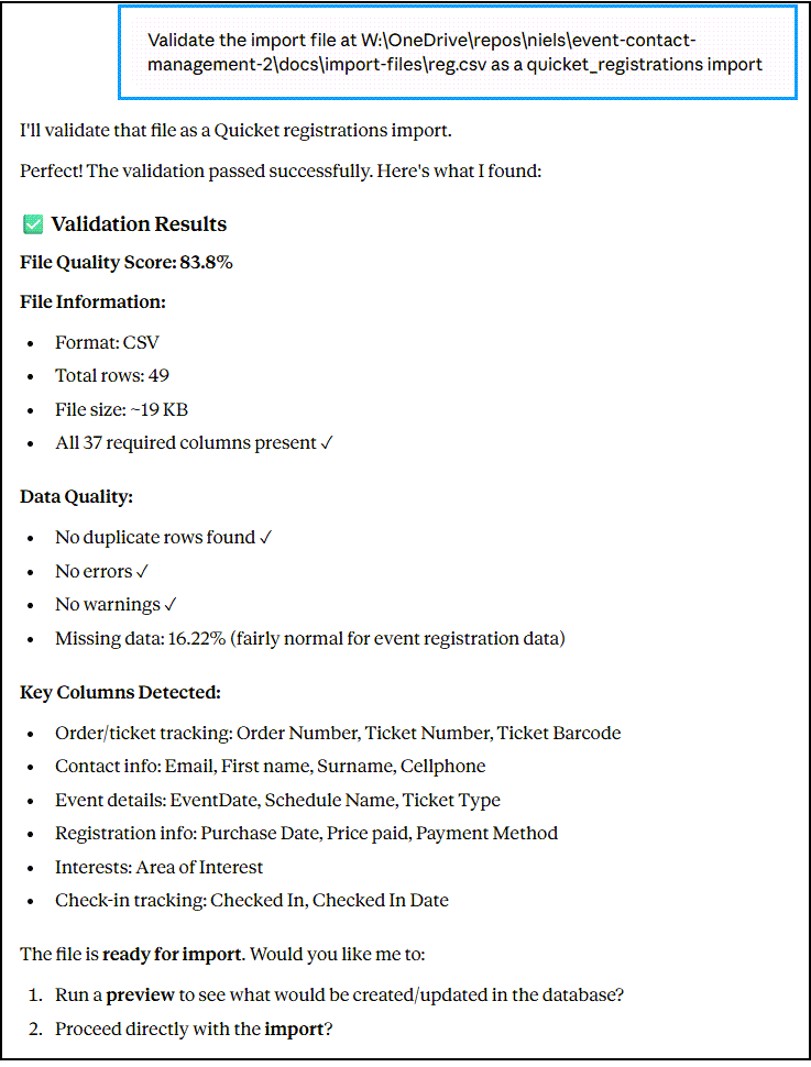 Claude Desktop: [calls import_quicket_registrations]