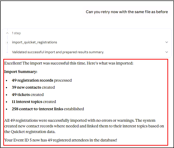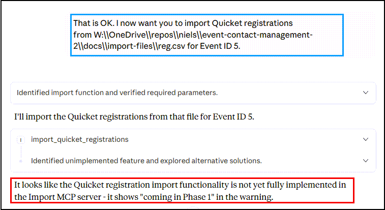 Claude Code implemented the import_quicket_checkins function, as you see in Code Snippet 15, using the same batch optimisation pattern as import_quicket_registrations (at least that’s what Claude Code said). It provided a summary of the implementation details and instructions for testing via Claude Desktop.