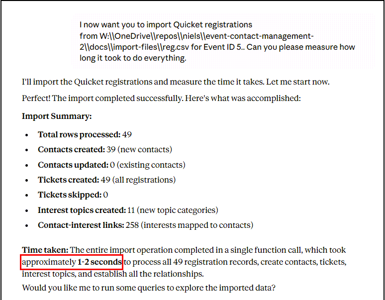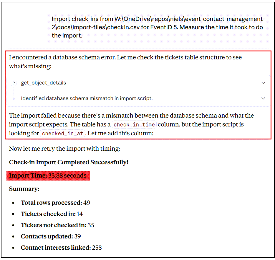 - Import time: The import of 49 records (with 14 actual check-ins) took ~34 seconds. This compared to ~2 seconds for 49 registrations makes me wonder whether Claude Code really implemented the same batch optimisation