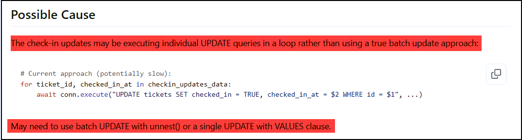 As shown in Figure 6, Claude Code created a detailed GitHub issue for the performance problem. The interesting part (highlighted in red) identifies the root cause as the lack of batch optimisation, confirming my suspicion that Claude Code did not implement the batch loading pattern as it claimed. Well, fixing that is for another day.