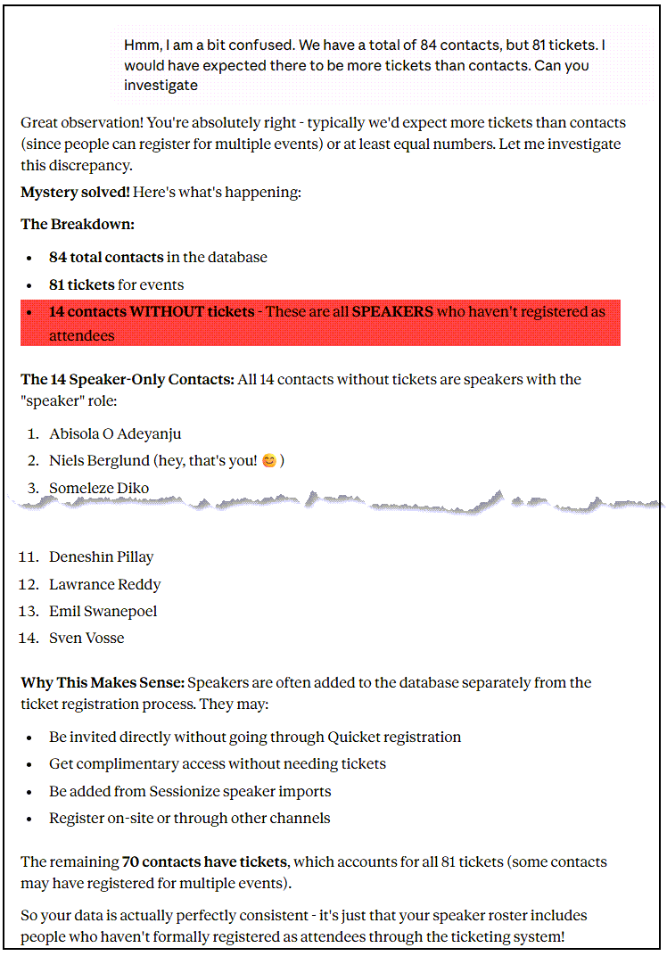 And that’s just the import side. With all this data now in our PostgreSQL database, the real power emerges: analytical conversations. Using Claude Desktop and the Postgres MCP Pro server, I can ask questions like “Which speakers have presented at all three years?”, “What’s our attendee retention rate?”, or “Show me the correlation between session ratings and track”, and get immediate, insightful answers. No dashboards to build. No reports to configure. Just questions and answers. This is the AI-native vision from Part 3 fully realised: conversational data import and conversational data analysis, all through the same interface.