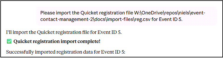 Me: "Import the Quicket registrations from march-2025-reg.csv for event 10"