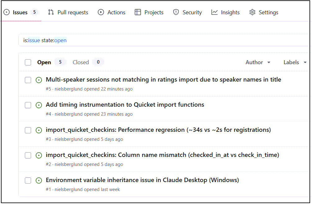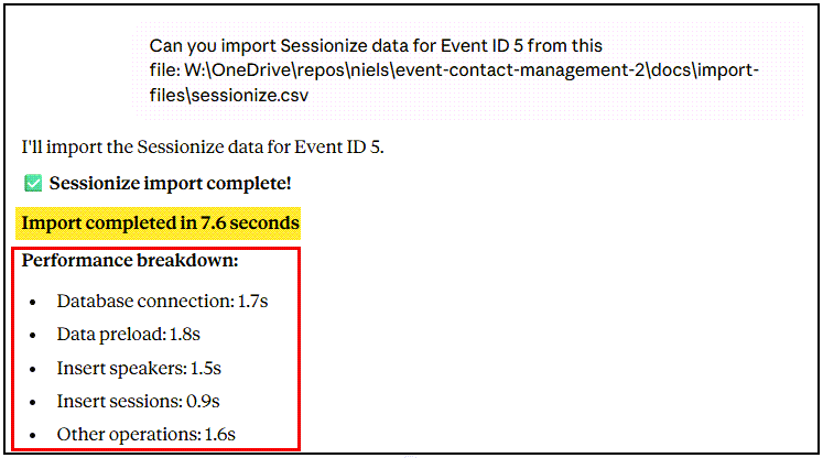 Autonomous mode is powerful, but I learned an important lesson: Claude Code can claim to have done something without actually doing it. The Part 8 checkins “batch optimisation” and the slower-than-expected Sessionize import both suggest that verification is essential.